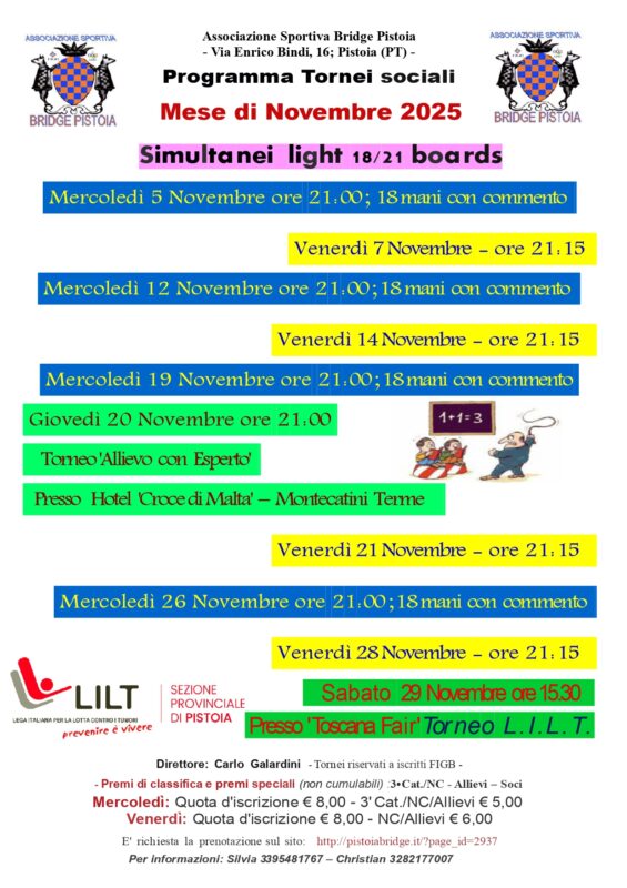 Si è svolto Martedì 23 Settembre 2025 nei locali del Circolo Bridge di Pistoia il terzo appuntamento del Torneo ‘Allievo con Esperto‘.