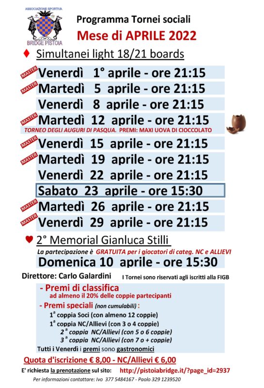 PROSSIMO TURNO DEL MASTER:   MARTEDI’ 5 APRILE ORE 21:15